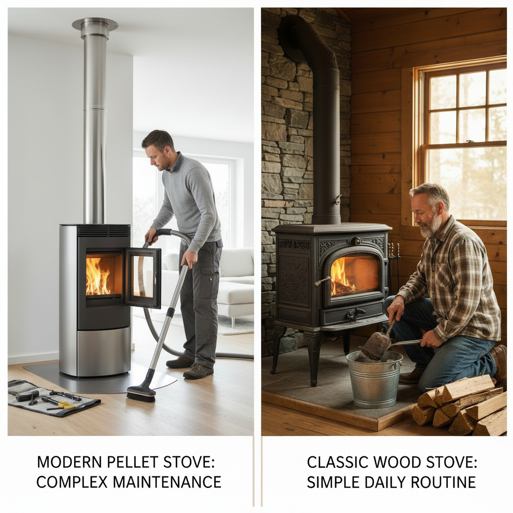 Pellet stoves need cleaning every week. Wood stoves? Just daily ash removal. We're certified technicians who've maintained 2,000+ units over 20 years. Here's what we learned.
