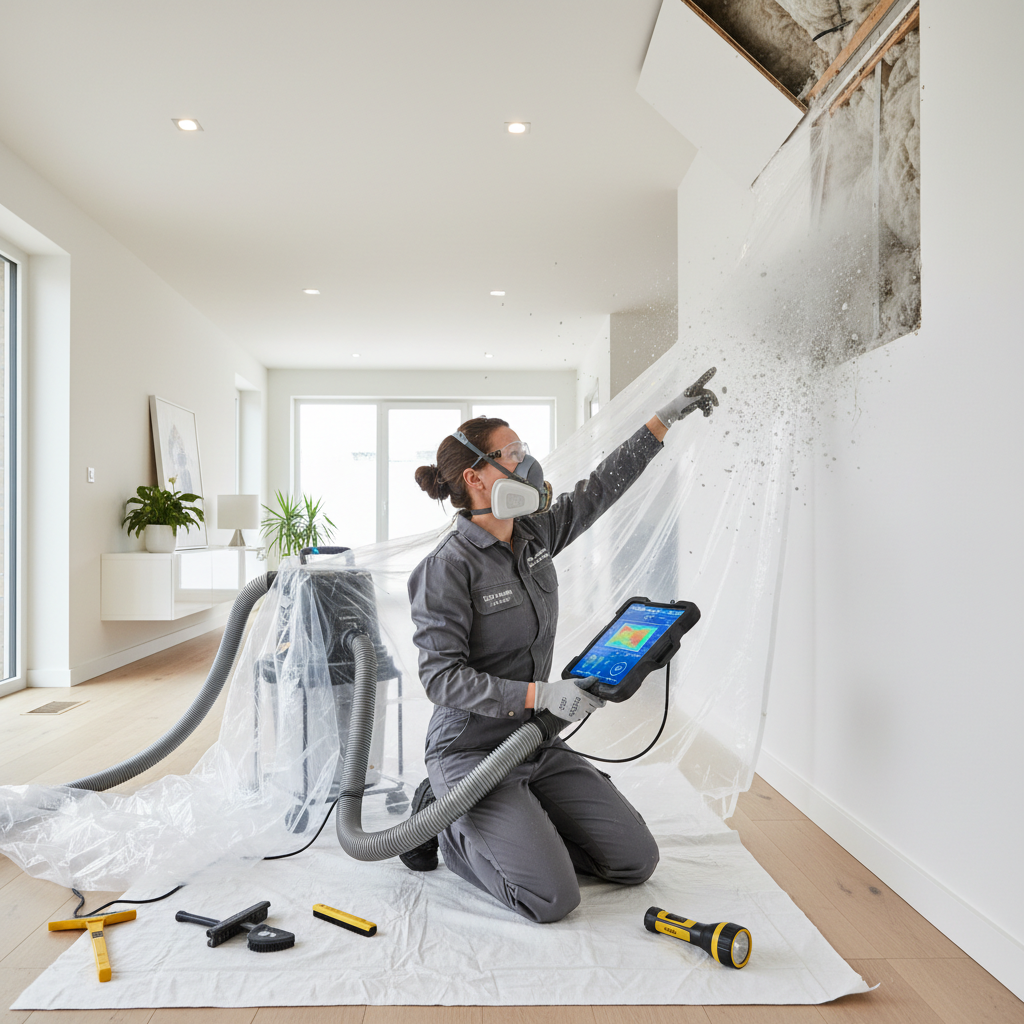 Assess the extent of the dust and debris spread (confined to attic, spread to living spaces).