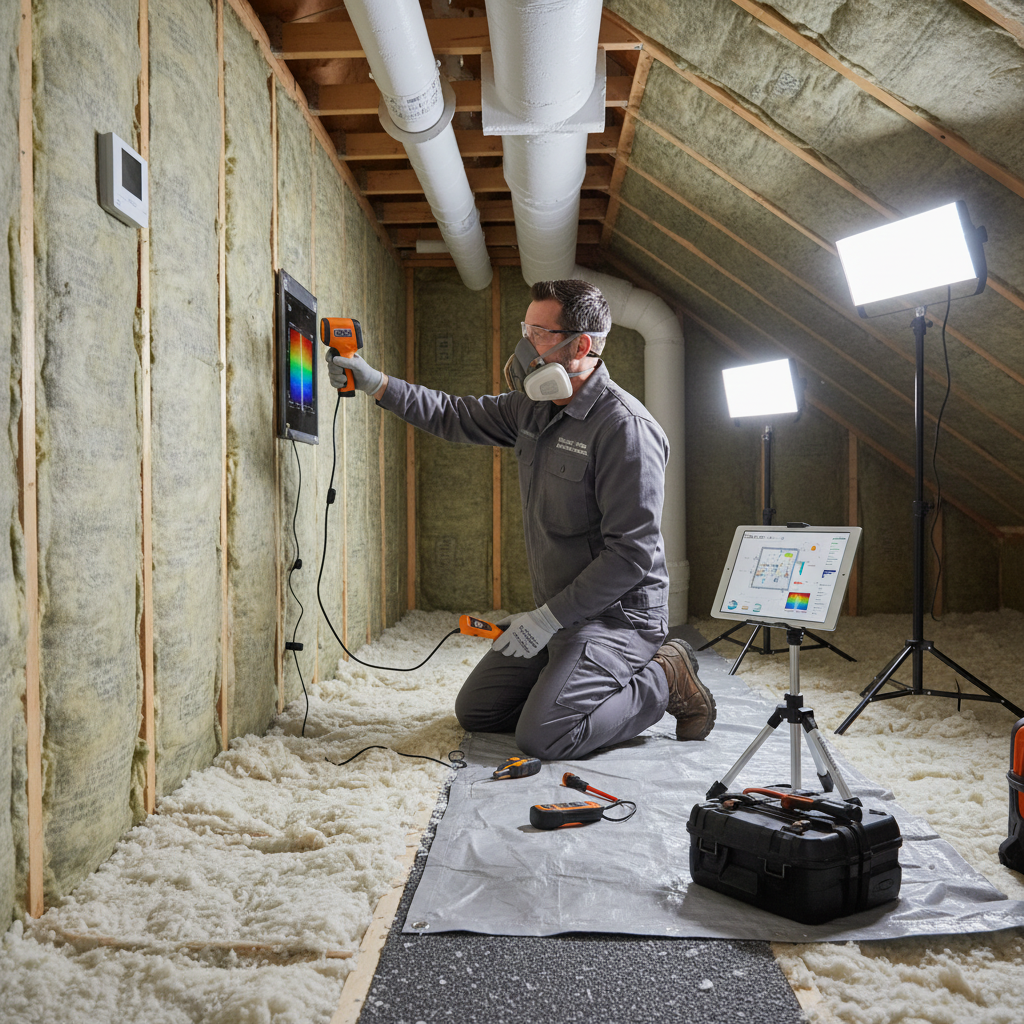 Visual Attic Inspection: Using a flashlight and mask, check insulation for proper depth (12-15+ inches), even coverage, signs of compression, water stains, mold, or pest activity.